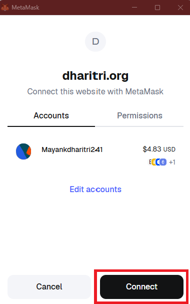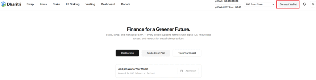 1. Open prewa.dharitri.org in your browser and Click “Connect Wallet”